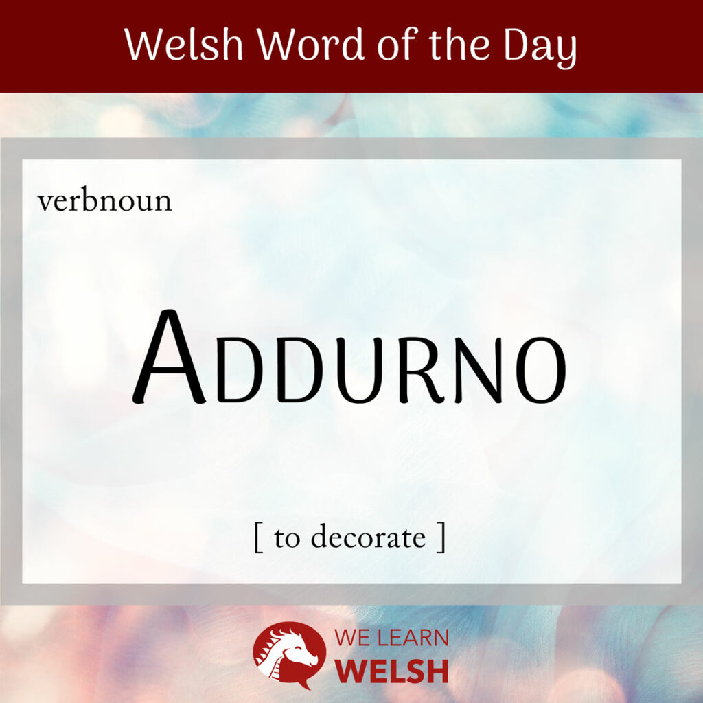 Addurno is most commonly translated as to decorate, but it can mean, in various contexts, to embellish, to adorn, to decorate, to beautify, and historically even to tidy. Its The words harddu and prydferthu – both of which literally mean to beautify as they come from the adjectives hardd and prydferth meaning beautiful – are the closest thing we have in Welsh to an exact synonym of it.