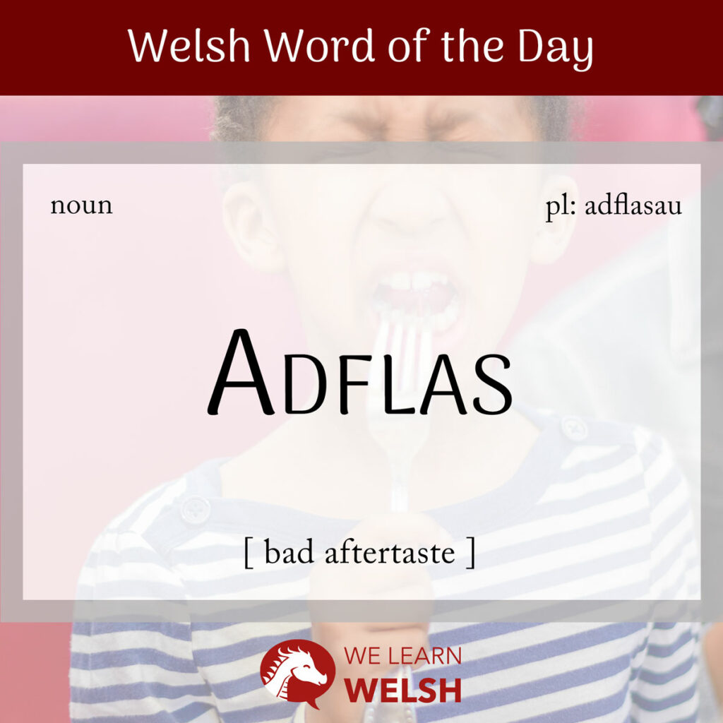 One wonderful thing about learning a new language is all the words you can encounter that can’t necessarily be said in quite the same way in your first. One word I like in Welsh that English can’t capture is adflas, which means an unpleasant aftertaste. It’s a masculine noun with the plural form adflasau.