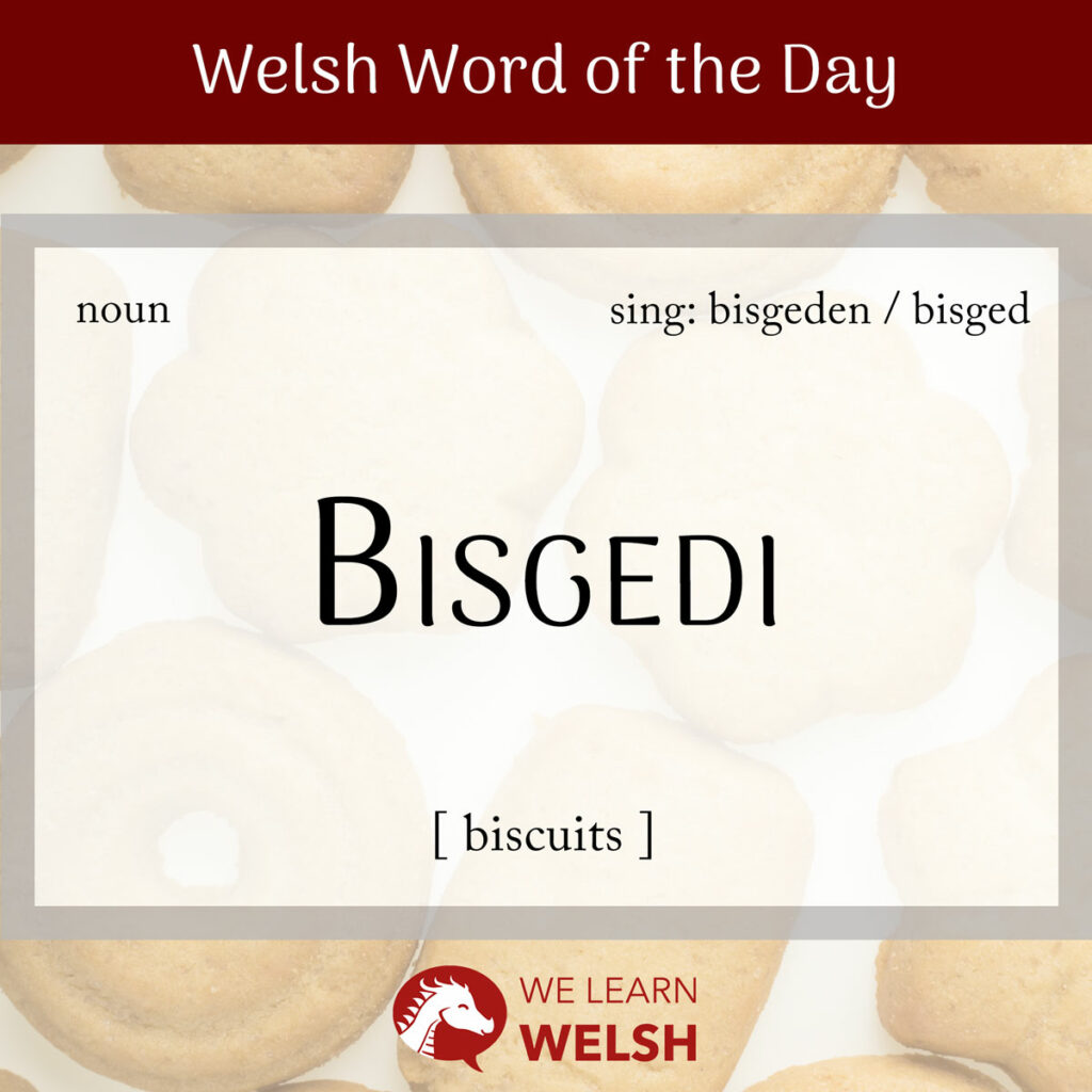 Like a lot of food words in Welsh, the ‘default’ form of bisgedi is the plural. Words for the singular vary (but they are all feminine), with bisgeden preferred by more old-fashioned dictionaries, and the simple bisged possibly the most common colloquially.