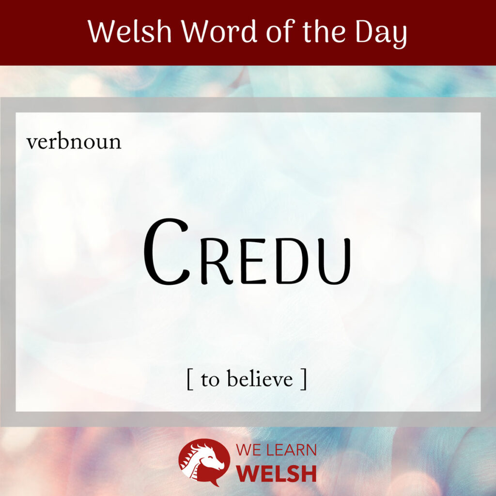 Today’s Welsh word of the day is the verb credu (to believe). You may not immediately find credu an easy word to cofio (remember), because it’s quite different from its English translation. But it’ll instantly become a lot easier when you realise that it comes from the exact same root as the similar English nouns creed and credence! When you’re saying you credu something in Welsh, it’s like saying you give credence to it in English.