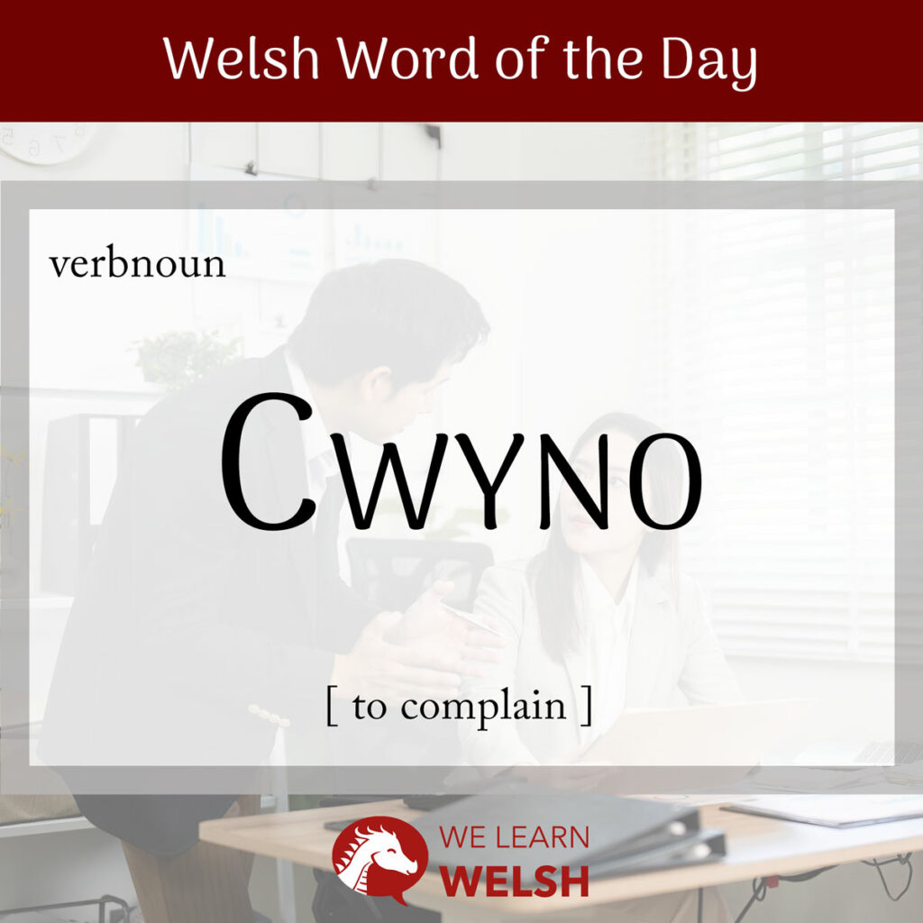 Cwyno isn’t the only way to say complain although it is the most common. There are some dialectical alternatives you may be familiar with if you hail from certain parts of the South, such as conan and ceintach, which probably come from the same root.